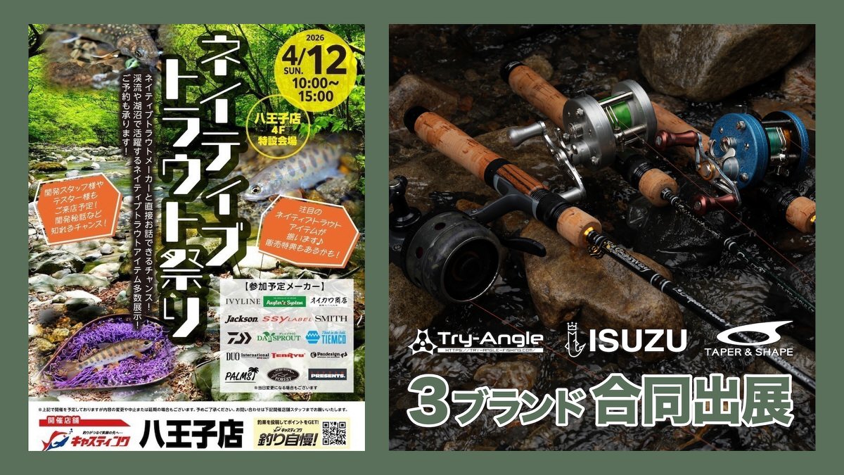 4月12日(日)キャスティング八王子店にて開催される『ネイティブトラウト祭り』にTRY-ANGLE/五十鈴工業/TAPER & SHAPE3ブランド合同ブースで出展します!五十鈴工業製リール、渓流ベイトフィネス用カスタムパーツやルアー、TAPER & SHAPEのトラウトロッドなど展示販売予定です。実機に触れてお買い求めいただけるチャンス!ぜひご来場ください。