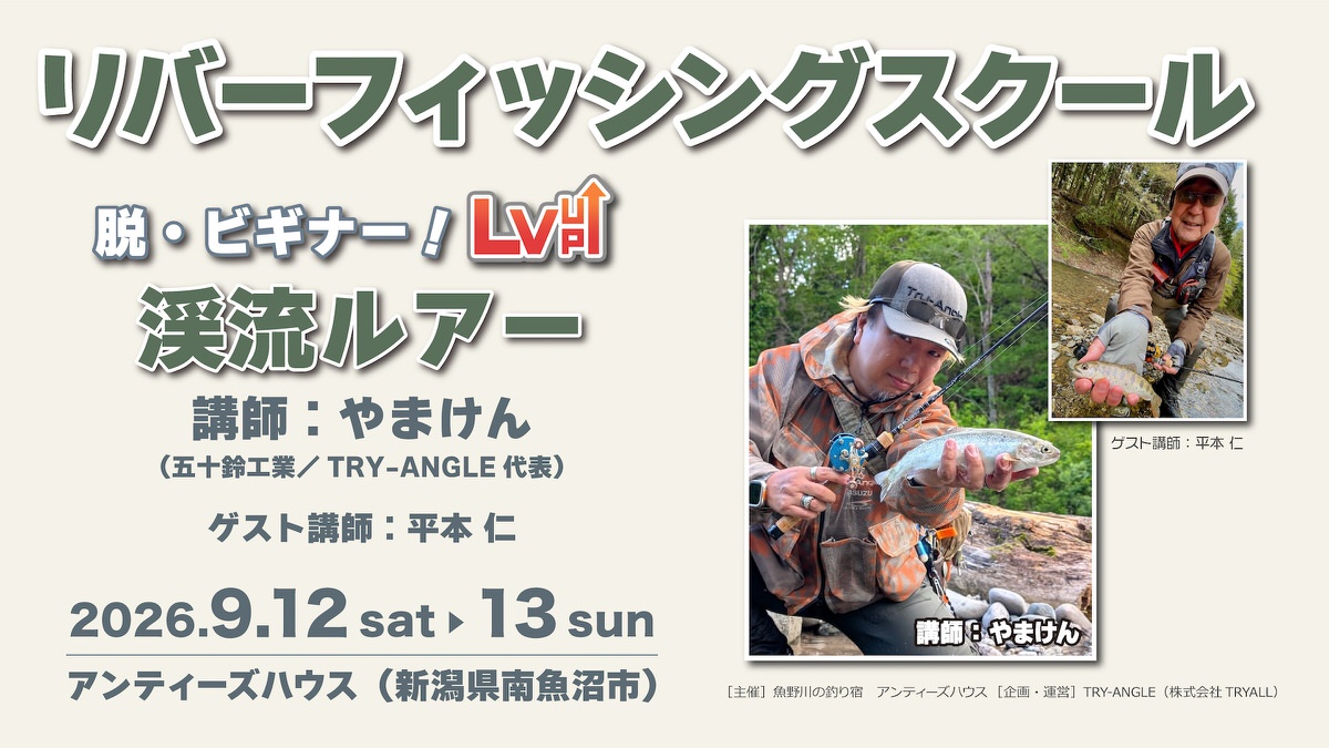 毎年恒例のやまけん渓流ルアースクール。今年もゲスト講師にD-コンタクトの生みの親、平本仁さんを迎えてお送りします!土曜日は座学、日曜日に実釣スクールの2日間。渓流ベイトのレクチャーを中心に、初級者→中級者、中級者→上級者へのレベルアップに最適なスクールです。土曜日午後にはTAPER & SHAPEのロッドや五十鈴工業製リールなどの特別販売会も予定しています。初心者の方、スピニングタックルの方もお気軽にご参加ください!